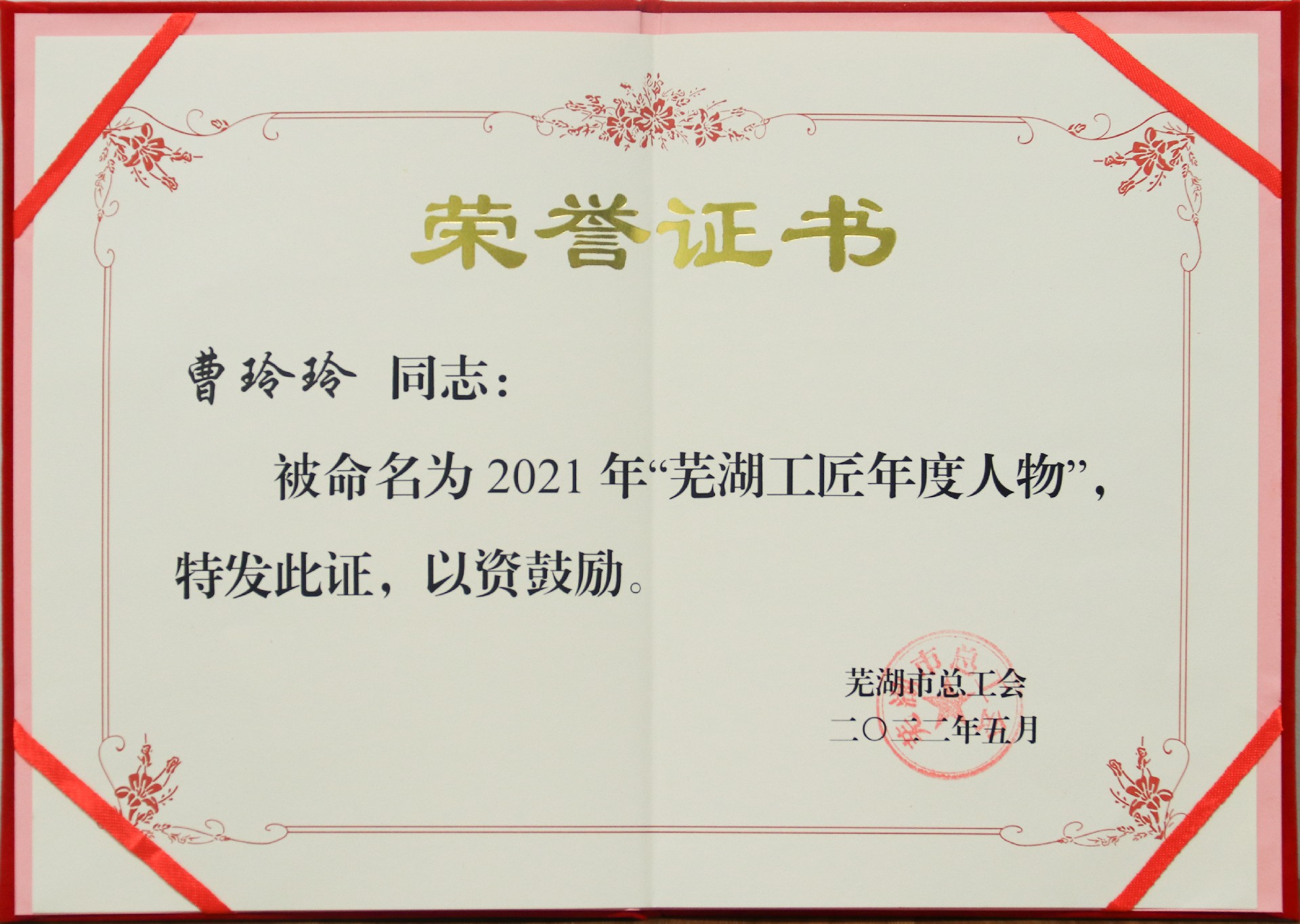 榮獲2021年“蕪湖工匠年度人物稱號(hào)